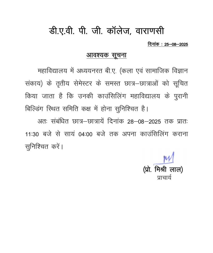 Counselling of B.A. IIIrd Semester (Arts and Social Science):-