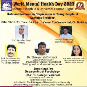 डी.ए.वी. पी.जी. कालेज के मनोविज्ञान विभाग में स्टूडेंट ओरियंटेशन प्रोग्राम का आयोजन किया गया। जिसका विषय ’’मनोवैज्ञानिक ज्ञान कौशल और करियर निर्माण’’ था। इस कार्यक्रम के मुख्य वक्ता डॉ. बी.सी.कर (साइंटिस्ट, डीआरडीओ) थे। उन्होंने कहा कि मनोविज्ञान के जरिए हम अपने को खुद खुश रख सकते हैं और दूसरों को भी खुश रख सकते हैं। इसलिए इसके स्वरूप जीवन जीने में काफी सहायता मिलती है। मनोविज्ञान से ही हमें जीवन में बेहतर निर्णय लेने की क्षमता विकसित होती है। मनोवैज्ञानिक परामर्श दैनिक जीवन की समस्याओं के समाधान में सहायक होता है आज वर्तमान की अति व्यस्त जीवनशैली और तनावपूर्ण माहौल में व्यक्ति को मानसिक रूप से स्वस्थ भी कर रहा है इसमें मनोविज्ञान की भूमिका देवदूत जैसी है। मनोविज्ञान एक नई दृष्टि देता है और इसका मूल मंत्र है कि दृष्टि बदलो तो सृष्टि बदल जाती है। मनोविज्ञान के माध्यम से खुश रहने के तरीकों का भी वर्णन डॉ बीसी कर ने किया। और कहा कि जीवन में यदि खुश रहना है तो रोमांचक बदलाव लाएं और इससे व्यक्ति उर्जावान महसूस करता है।
